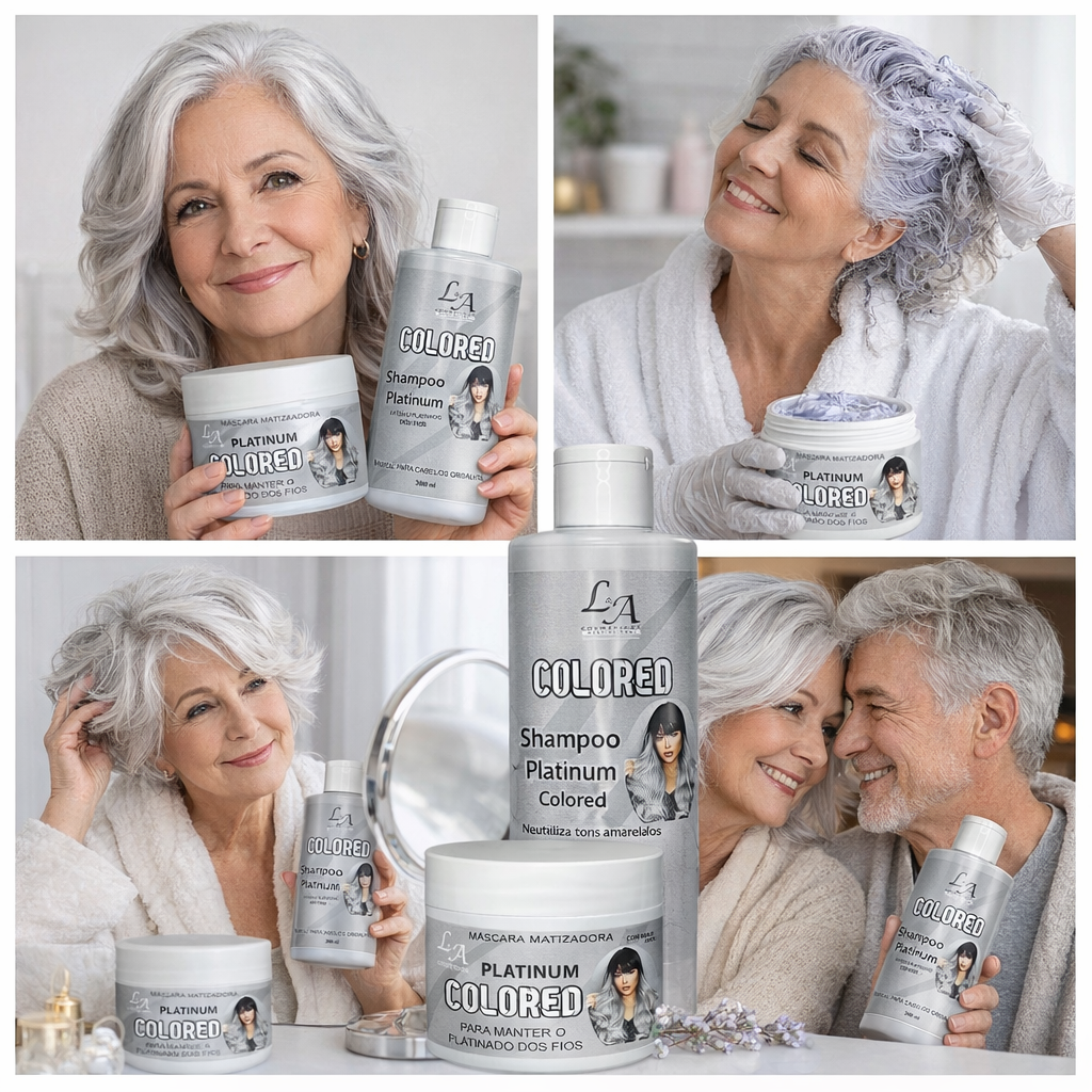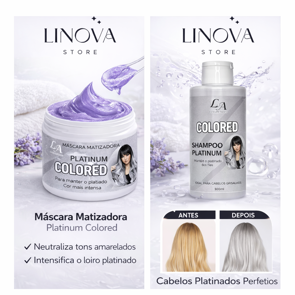 o Shampoo Platinum remove impurezas sem ressecar, enquanto corrige a cor e mantém o platinado vivo. Já a Máscara Matizadora Platinum hidrata intensamente, sela a fibra capilar e prolonga o efeito da cor, deixando os fios macios, sedosos e cheios de vida.