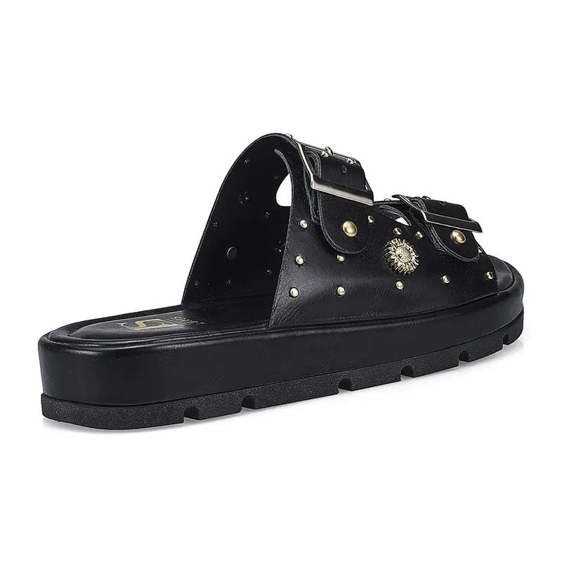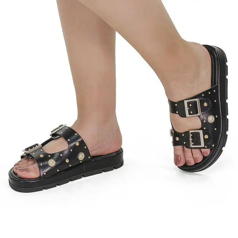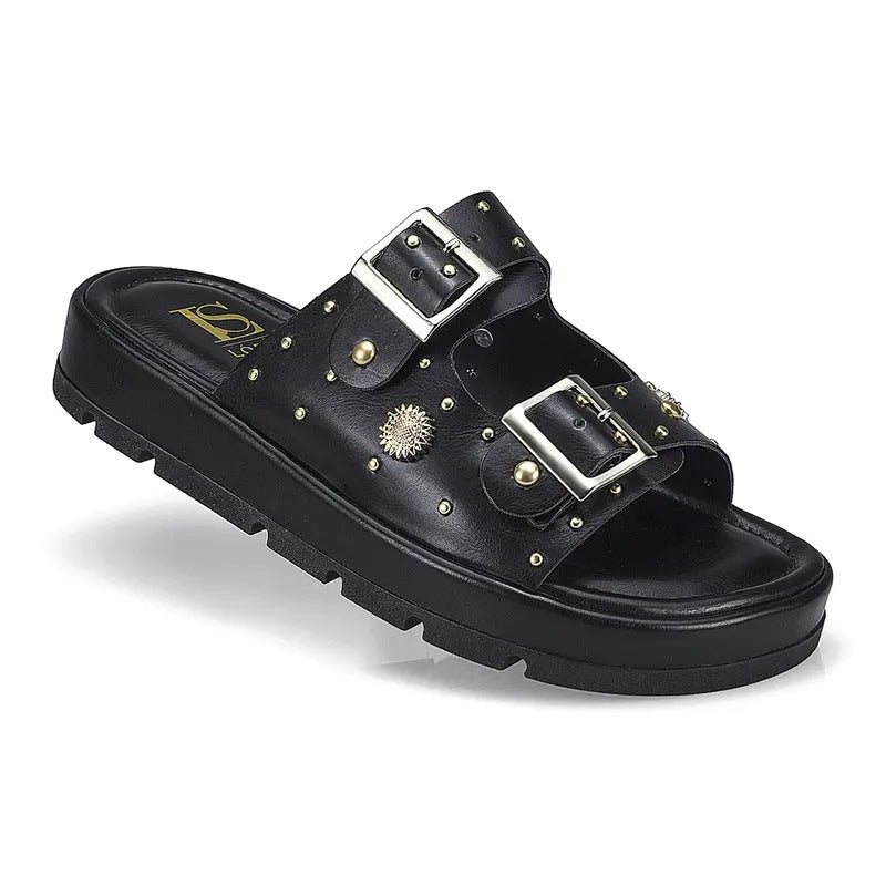 Sandália Rasteira Papete Plataforma Dourada Luxo com Fivelas Ajustáveis