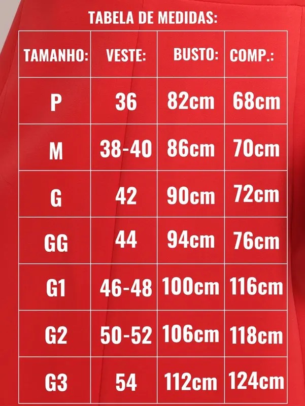 (P, M, G, GG, G1, G2, G3 – conforme tabela do fabricante)